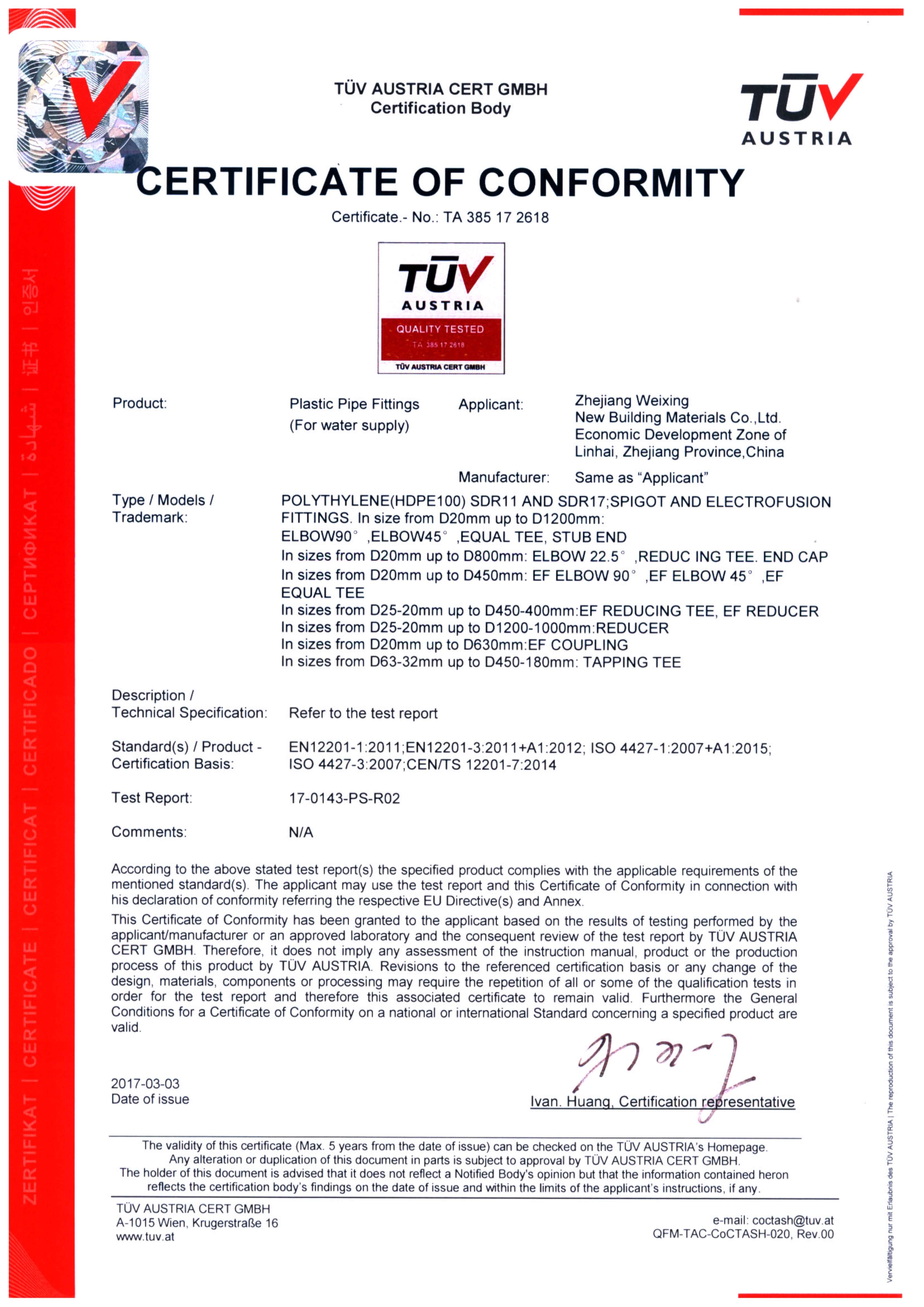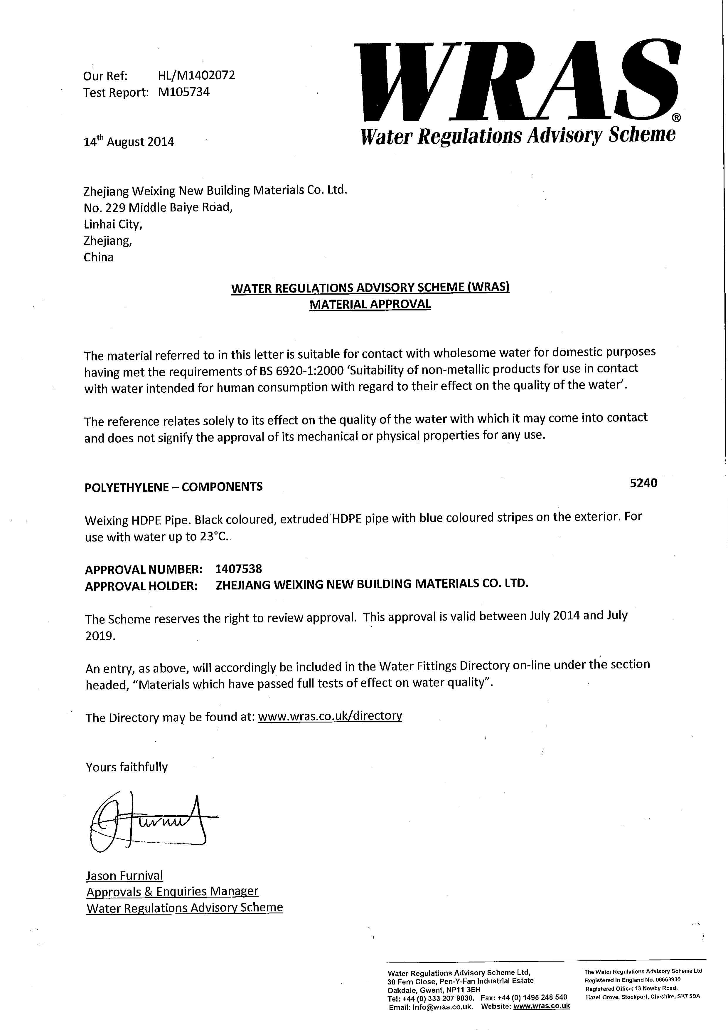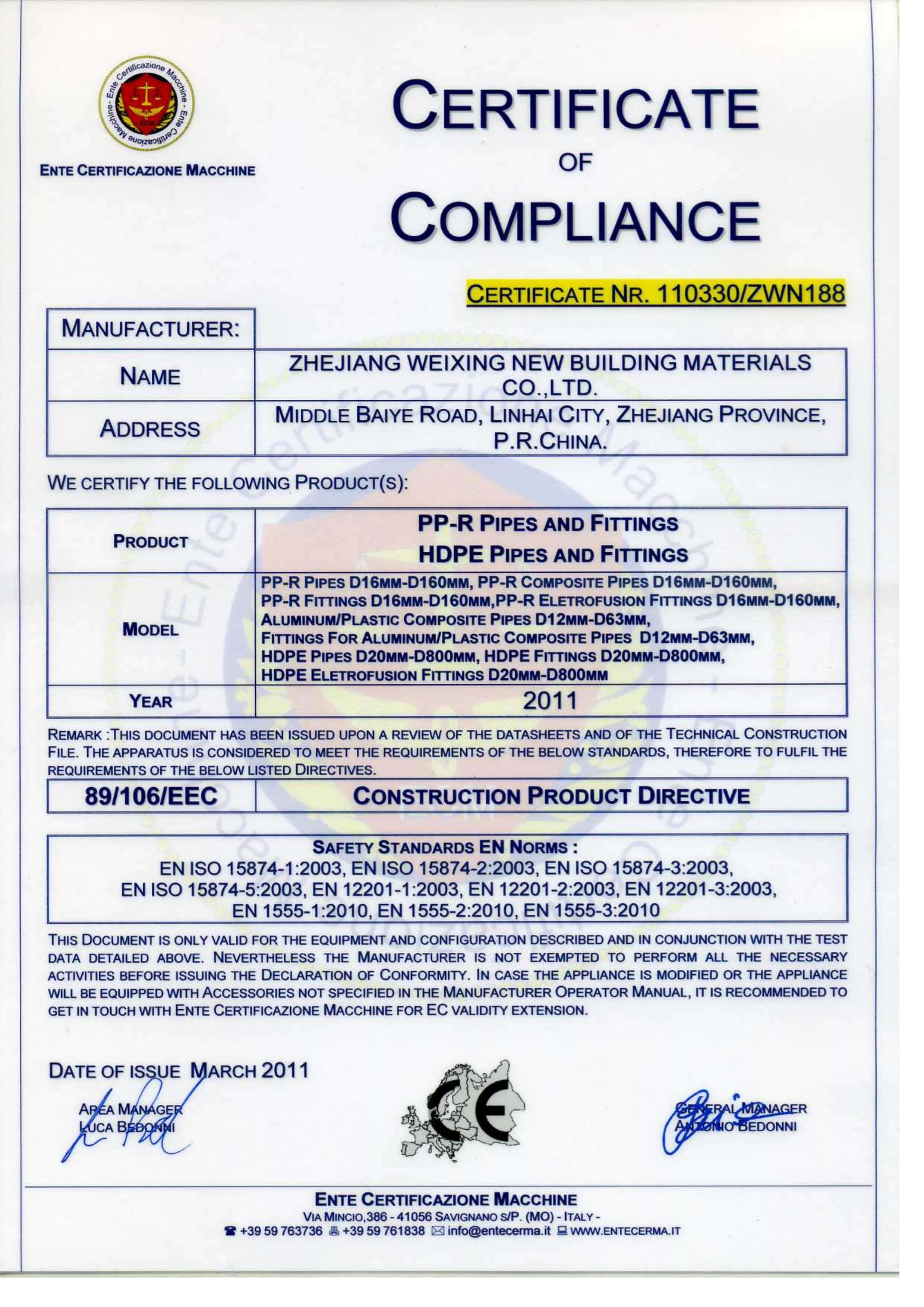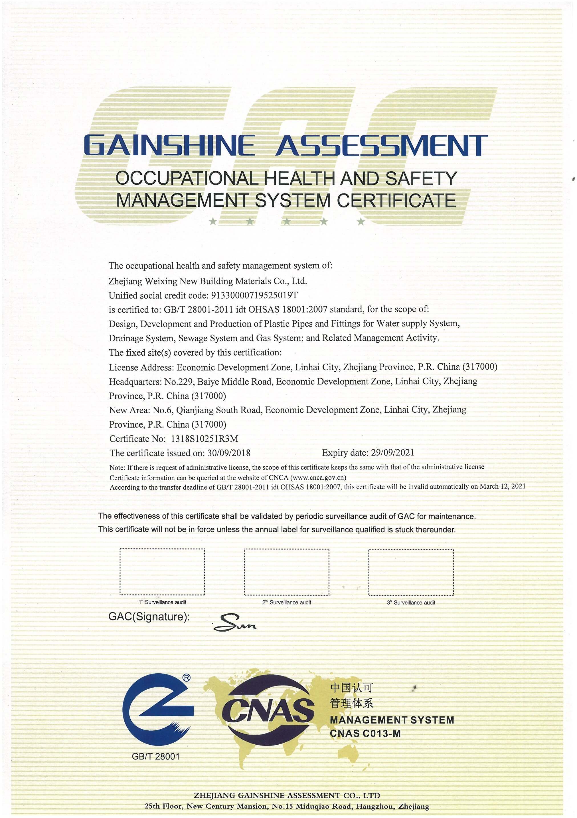 With six modern production bases in Zhejiang, Shanghai, Tianjin, Chongqing, and Xi’an, Thailand,Weixing NBM now has solid strength in R&D: we have testing centers which have been accredited by CNAS (China National Accreditation Service for Conformity Assessment); we have high-tech research centers in provincial level; also through great efforts, Weixing NBM takes the lead in passing ISO9001 quality management system and ISO14001 environmental management system, and get the international approvals of DVGW, AENOR, WRAS, TUV, CE and so on.