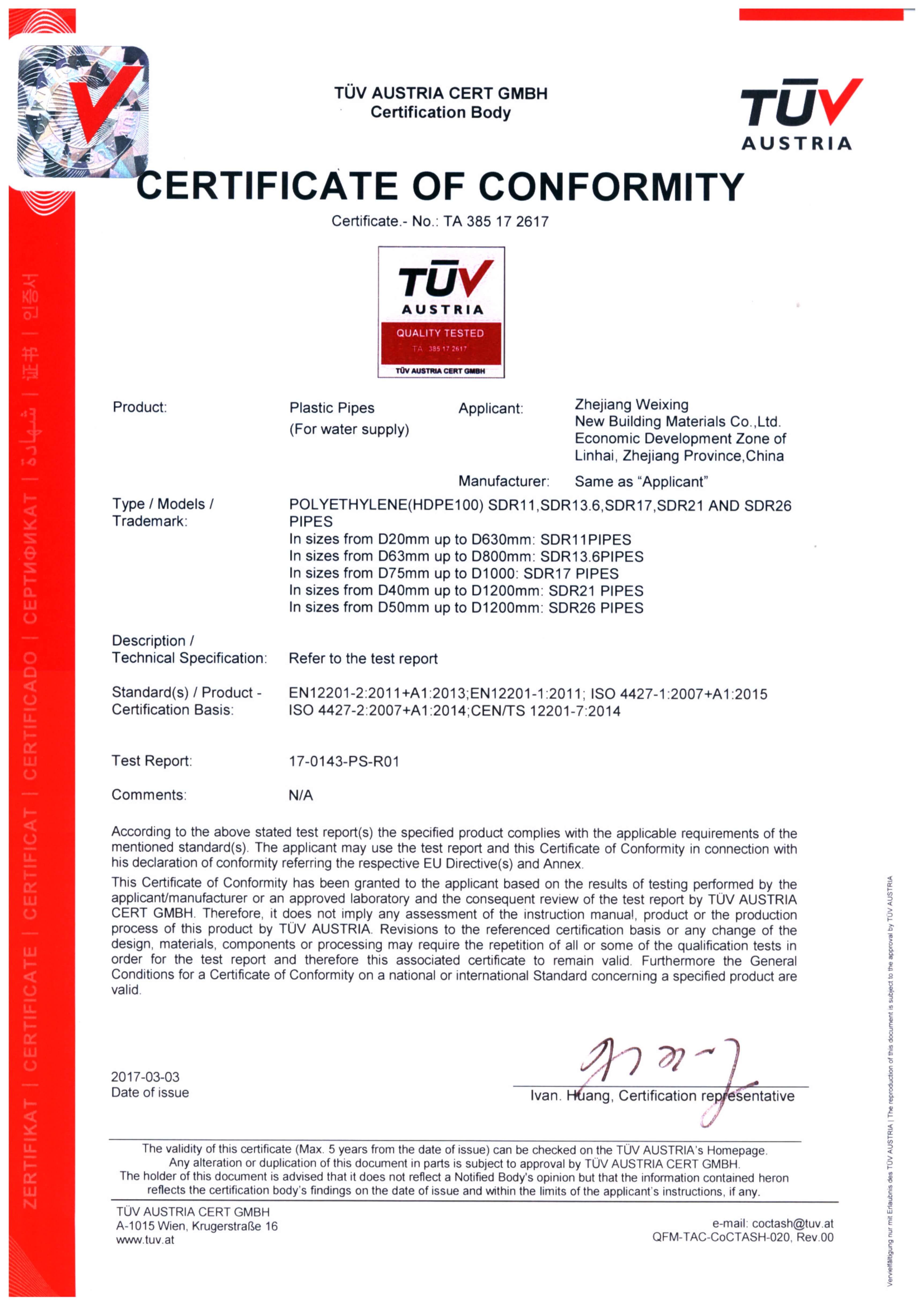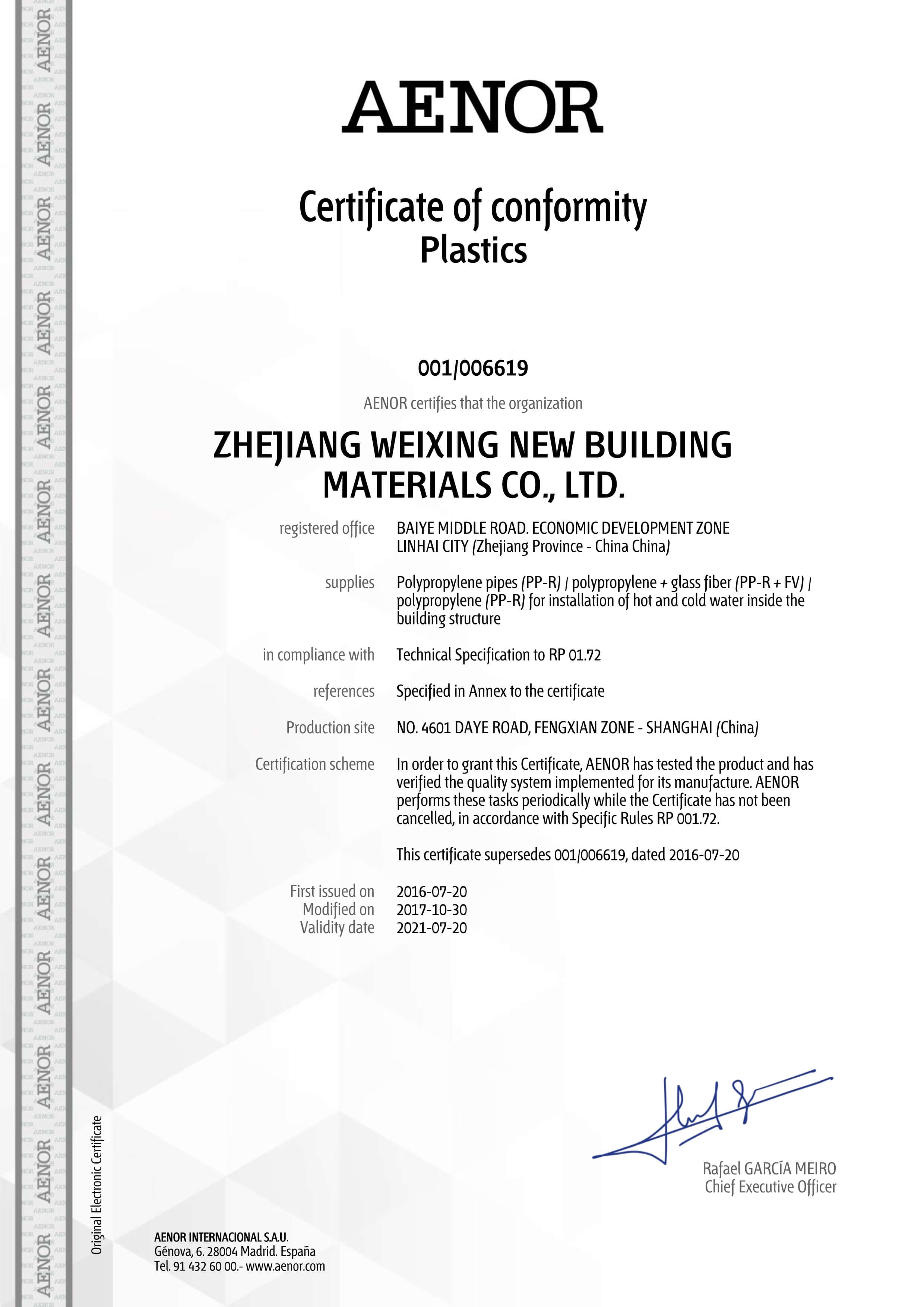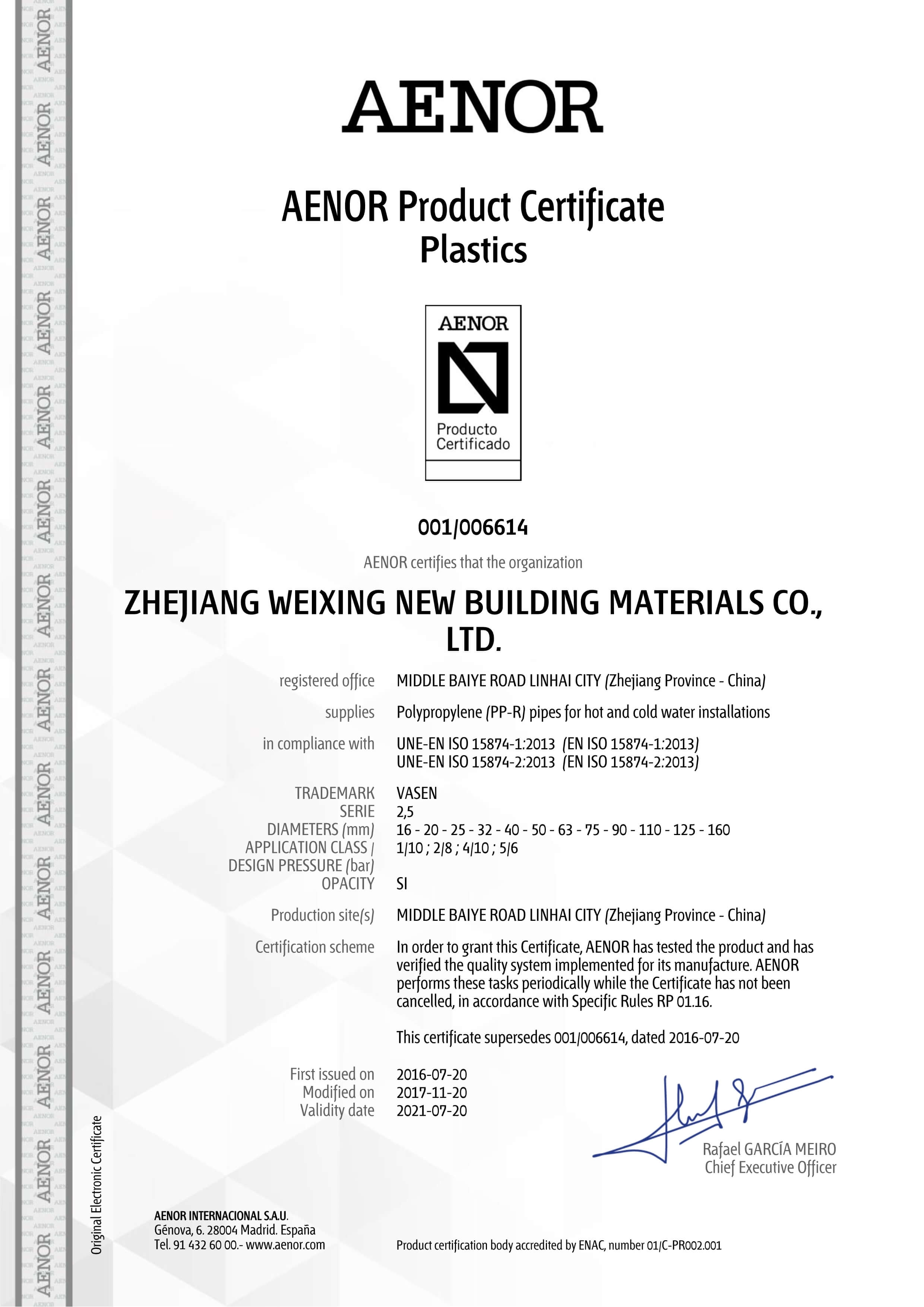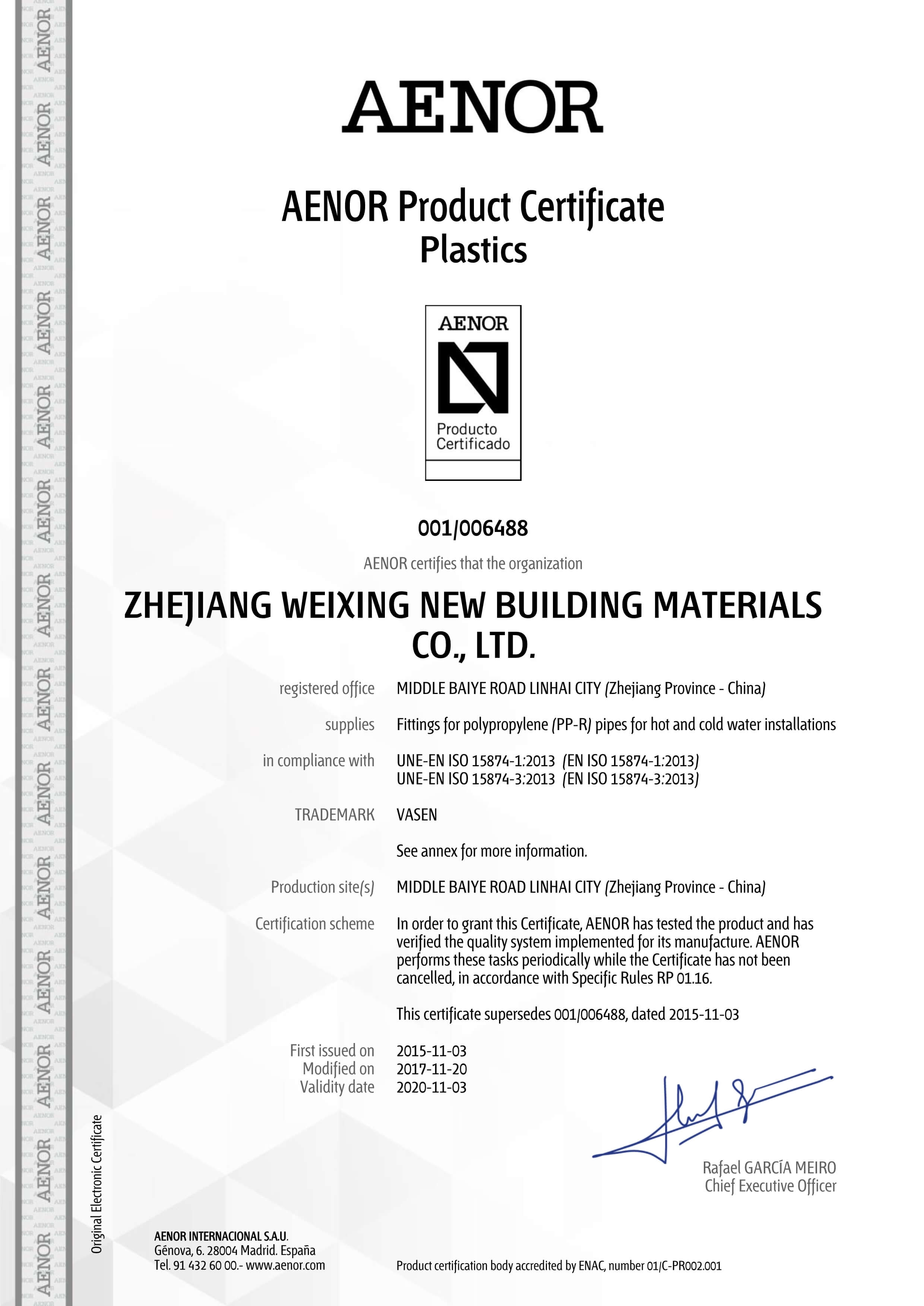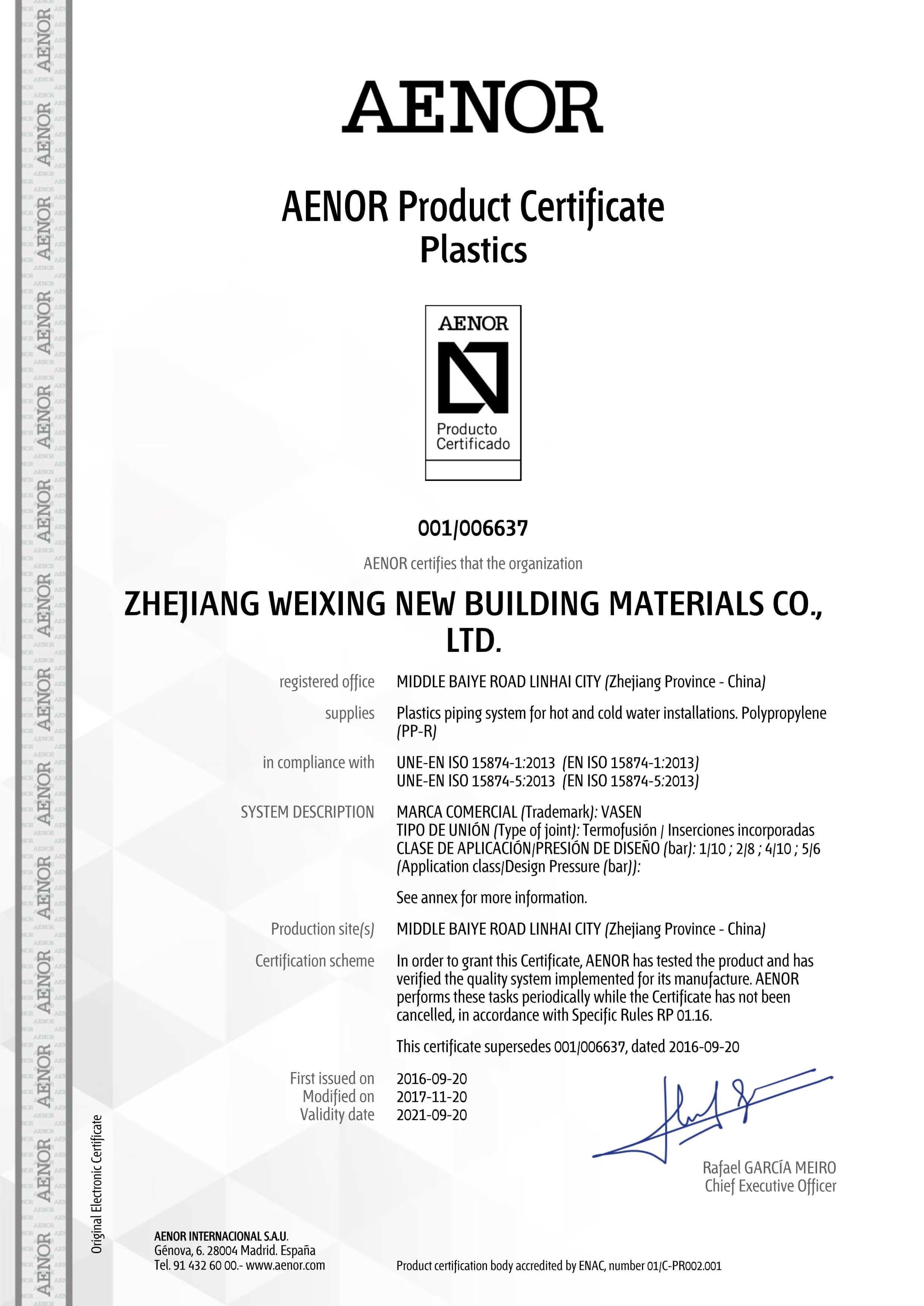 Established in 1999, Weixing NBM specializes in R&D, manufacturing and sales of various of high-quality, high value-added new plastic pipes. We are the leading manufacturer of PPR pipes in China, and also one of the few listed companies in the domestic plastic pipe industry (stock code: 002372, International Brand: VASEN). Now we mainly own three brands: Weixing, annette, and KALE.