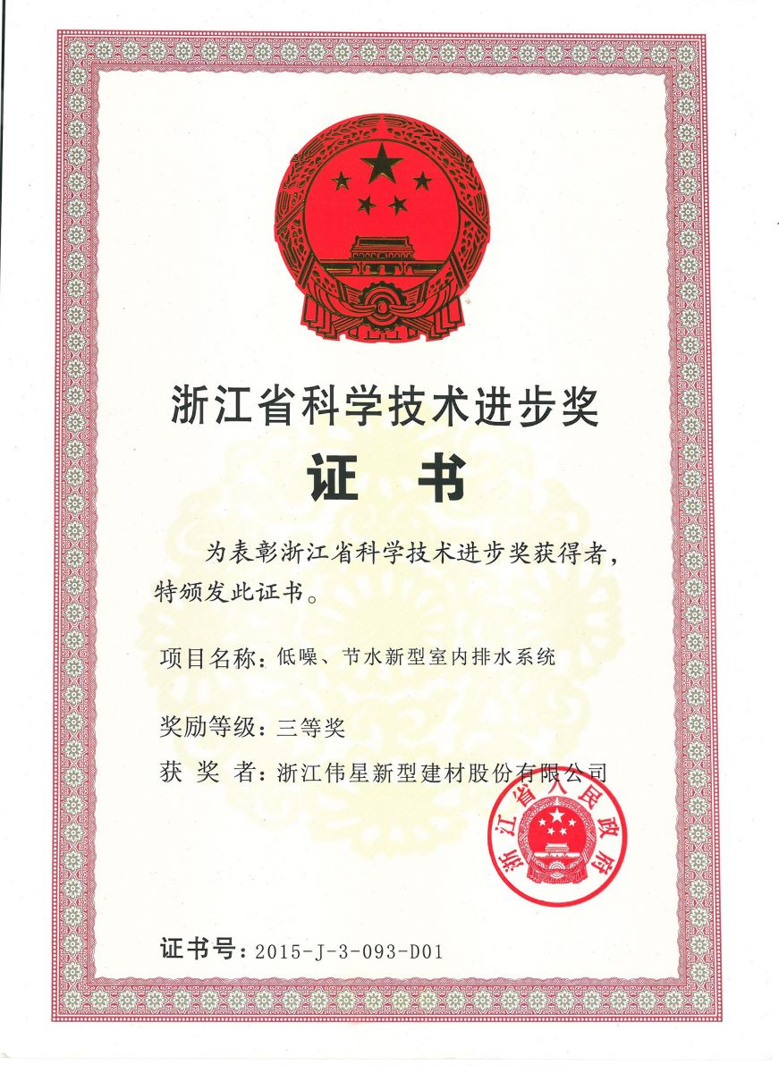 公司自主開發的低噪、節水新型室內排水系統,經浙江省科學技術獎行業評審組評定為浙江省科學技術進步獎三等獎,充分彰顯公司自主研發創新實力。