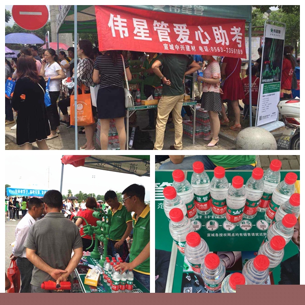 在蕪湖,偉星新材代理商組織了8輛汽車,加入了蕪湖電視臺“愛心助考車隊”活動,通過流動接送和一對一送考兩種方式免費接送廣大考生,這已成為蕪湖高考期間最動人的風景。同時在校外免費提供礦泉水,在炎熱的夏天為考生和家長送來清涼。