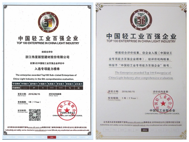 6月15日,由中國輕工業聯合會主辦、中國輕工業信息中心承辦的以精品制造、服務全球;為主題的;第五屆中國輕工業企業家高峰論壇暨百強企業頒獎盛典”在北京舉辦。大會隆重發布2015年度中國輕工業百強企業榮譽榜單,偉星新材憑借良好的市場口碑及在塑料管道行業的強大影響力,價值能力排名第九位,被大會授予;中國輕工業專項能力百強企業稱號。