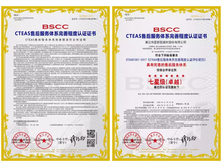 偉星新材符合CTEAS1001-2017《CTEAS售后服務(wù)體系完善程度認(rèn)證評(píng)價(jià)規(guī)范》標(biāo)準(zhǔn)要求,具有完善的售后服務(wù)體系,綜合評(píng)審達(dá)到七星級(jí)(卓越)