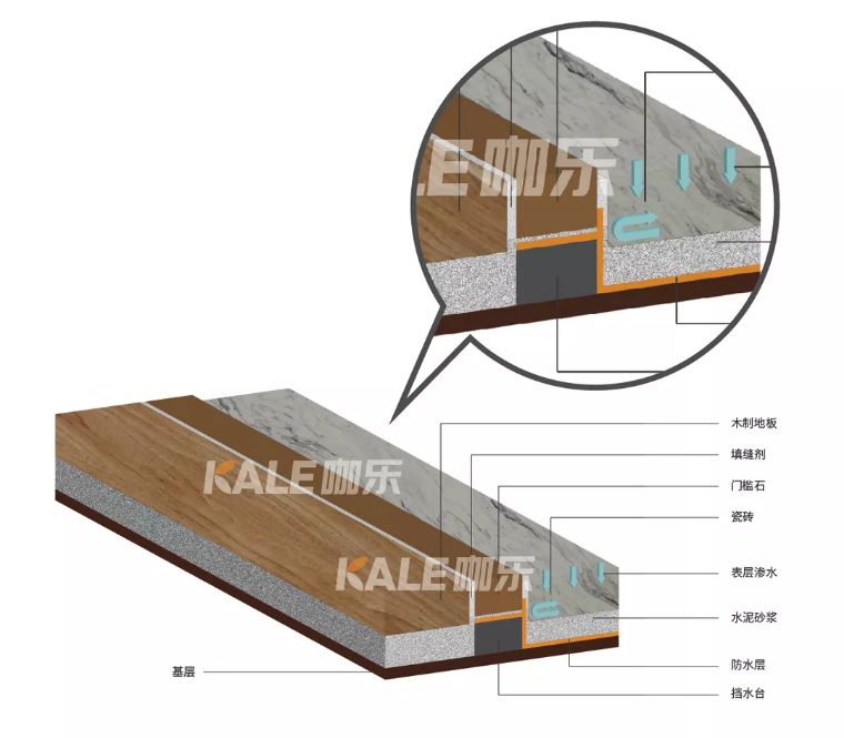 由于是先做防水后鋪門檻石,兩道工序之間相差較遠,人們就會選擇偷懶,對門檻石周圍也不進行防水處理。門檻石就會和擋水臺之間存在一定的縫隙,隨著時間的推移,由于衛生間的用水量比較大,地磚下面的防水層上方開始形成積水,慢慢地,當砂漿層中的積水高度超過了擋水臺的高度,水就會沿著防水層向往滲透了,示意圖如下: