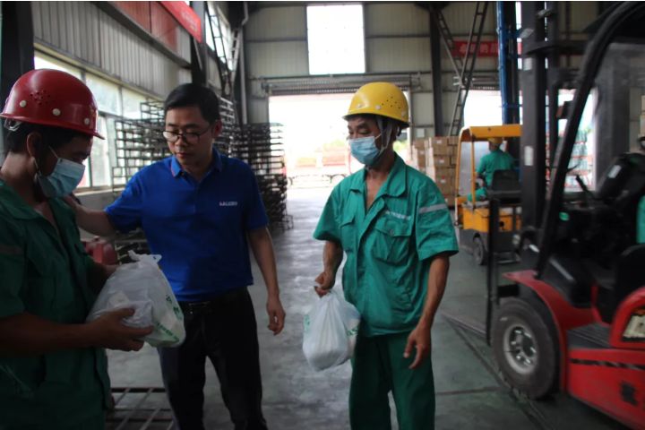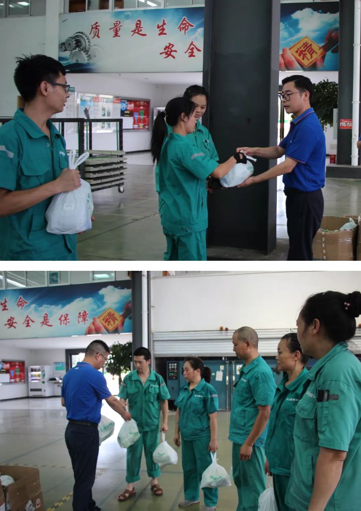 公司黨支部副書(shū)記、工會(huì)主席沈啟掌,黨支部委員俞家龍,來(lái)到車(chē)間、倉(cāng)庫(kù)等現(xiàn)場(chǎng),為員工送上了精心準(zhǔn)備的“清涼大禮包”。沈主席對(duì)一線職工在高溫天氣下堅(jiān)守崗位無(wú)私奉獻(xiàn)表示感謝,并叮囑他們要注意高溫期間的安全生產(chǎn)和健康保護(hù),并要求相關(guān)部門(mén)加強(qiáng)安全巡查,及時(shí)排除安全隱患,在完成生產(chǎn)任務(wù)的同時(shí),切實(shí)做好防暑降溫和安全生產(chǎn)工作,確保職工以飽滿的精神狀態(tài)投入到生產(chǎn)經(jīng)營(yíng)中。