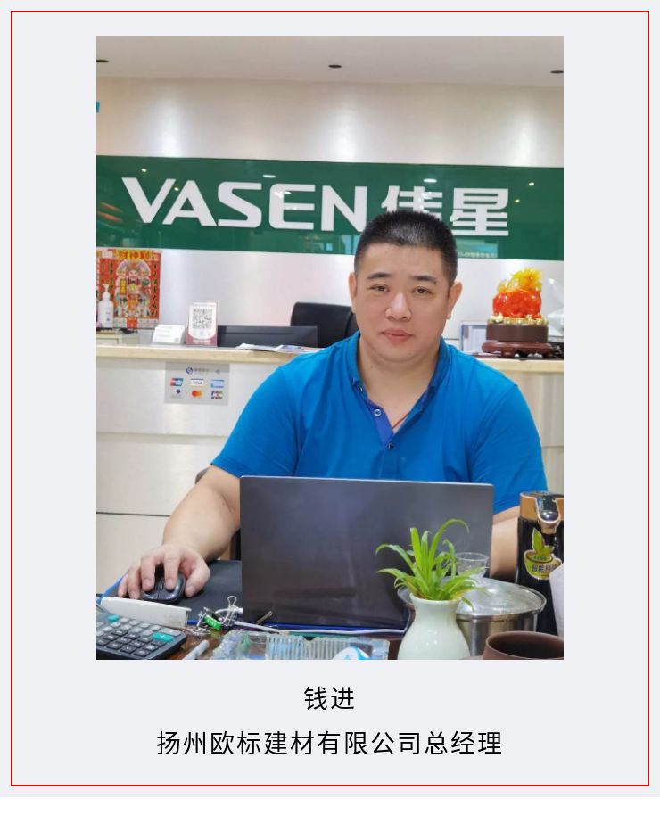 2020年錢進將店面裝修進行了升級,導入了全屋偉星系,讓進店的裝飾公司老板和項目經(jīng)理能夠更加直觀地了解偉星的全系列產(chǎn)品。錢進自豪地說,“全揚州我店里偉星的東西是最全的,包施工防水,包施工墻固,瓷磚背膠,都是我最先開始賣的。只要是偉星出來的產(chǎn)品,我有信心大賣,我都會全力去推廣。”
