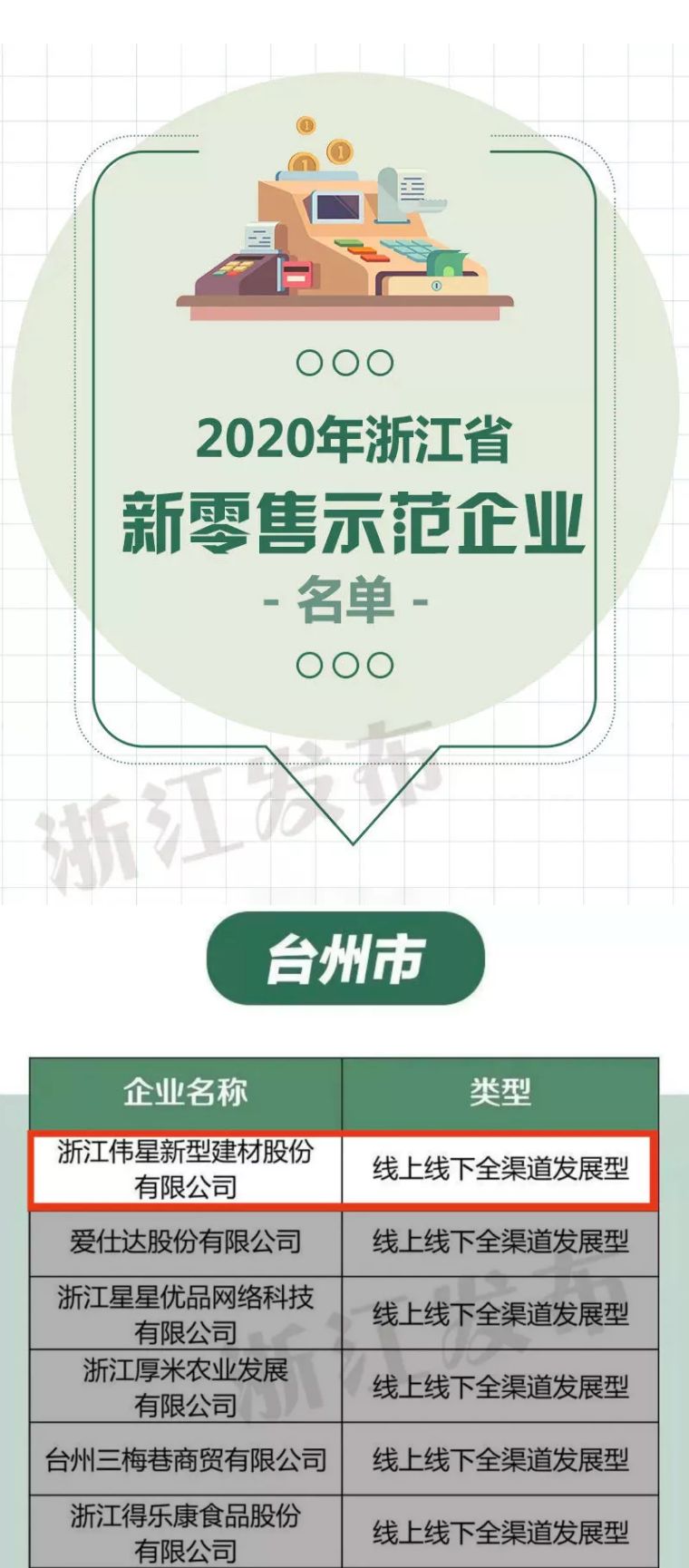 近日,經各企業自主申報,各市商務主管部門推薦,并由浙江省商務廳按照公開、公平、公正的原則組織評審,偉星新材被評為2020年浙江省新零售示范企業。