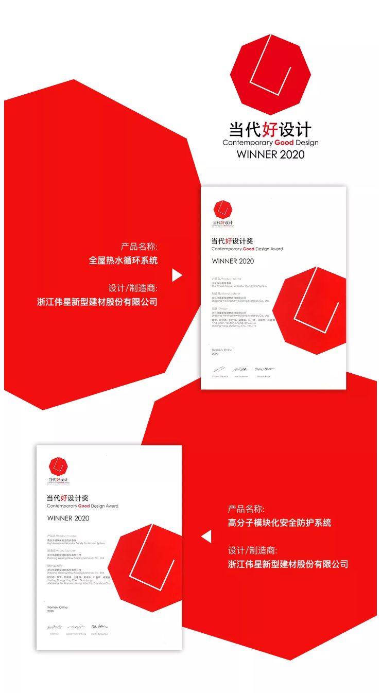 2020年12月18日,當代好設計獎項在廈門揭曉,偉星新材研發中心自主研發設計的 “高分子模塊化安全防護系統”和“全屋熱水循環系統”榮獲當代好設計獎,再次彰顯公司自主設計創新實力。