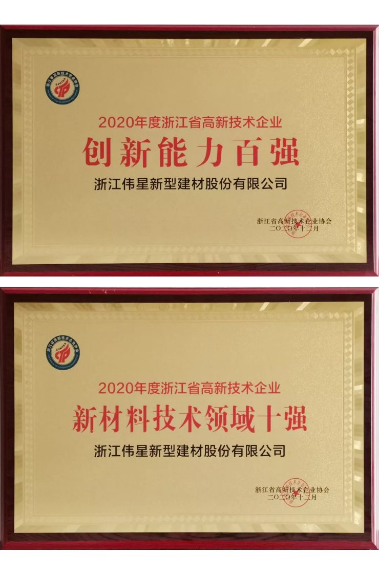 近日,2020年浙江省高新技術企業發展大會在杭州舉行,會議發布了2020年浙江省高新技術企業創新能力百強和行業十強榜單。偉星新材憑借優異的自主創新能力一舉摘得“2020年度高新技術企業創新能力百強”與“新材料技術領域十強”兩項稱號。