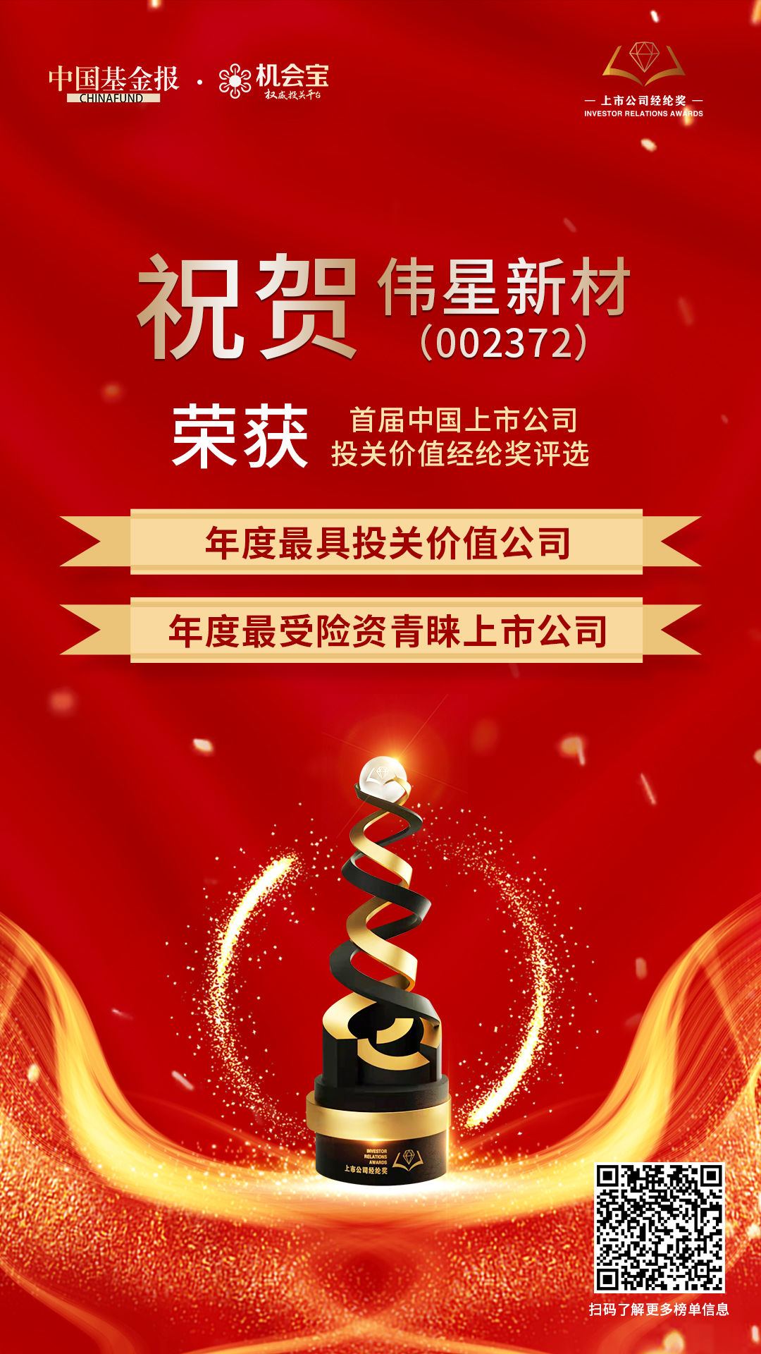 一直以來,偉星新材都十分重視投關(guān)工作,通過各種渠道加強(qiáng)與投資者的交流和溝通,實(shí)現(xiàn)公司價(jià)值的有效傳遞。此次獲得以上殊榮,充分體現(xiàn)了資本市場(chǎng)對(duì)偉星新材投關(guān)工作、品牌價(jià)值的高度肯定。未來,公司將繼續(xù)加強(qiáng)公司治理、完善信息披露,不斷創(chuàng)新投關(guān)工作方式,提升溝通價(jià)值!