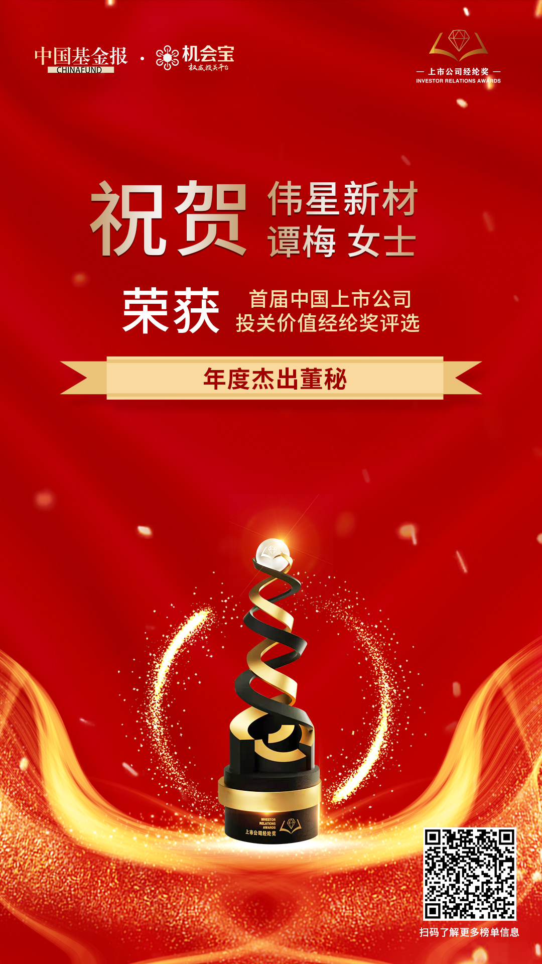 偉星新材榮獲“年度投關(guān)價(jià)值杰出公司”、“最受險(xiǎn)資青睞上市公司”榮譽(yù),公司董秘譚梅女士榮獲“年度杰出董秘”。