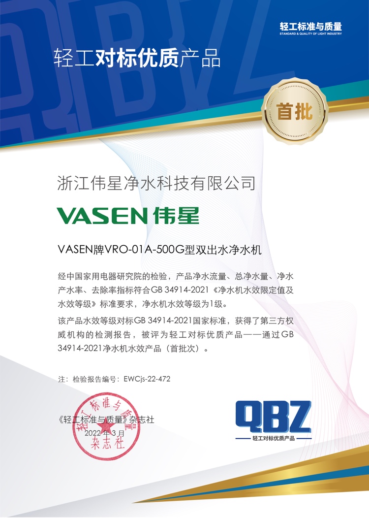 VASEN偉星500G反滲透凈水機經檢驗,凈水產水率測試結果達國家一級水效,并獲得第三方權威機構的檢測報告,被評為輕工對標優質產品——通過GB 34914-2021凈水機水效產品(首批次)!