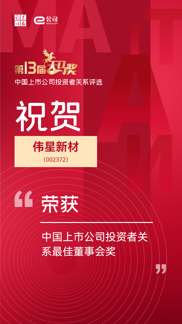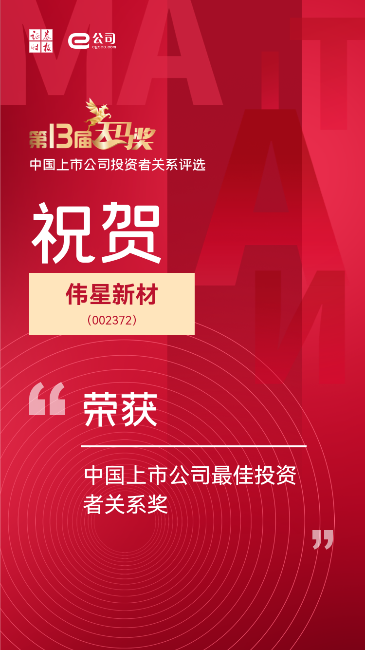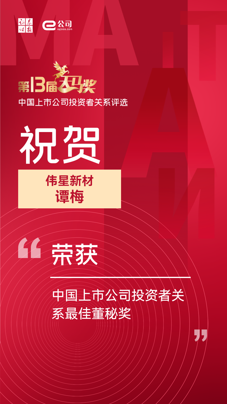 偉星新材再次榮獲中國上市公司“最佳投資者關系獎”“投資者關系最佳董事會獎”“投資者關系最佳新媒體運營獎”,公司董秘譚梅女士榮獲主板上市公司“投資者關系最佳董秘”。