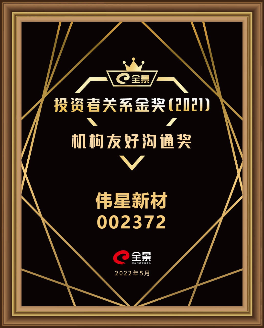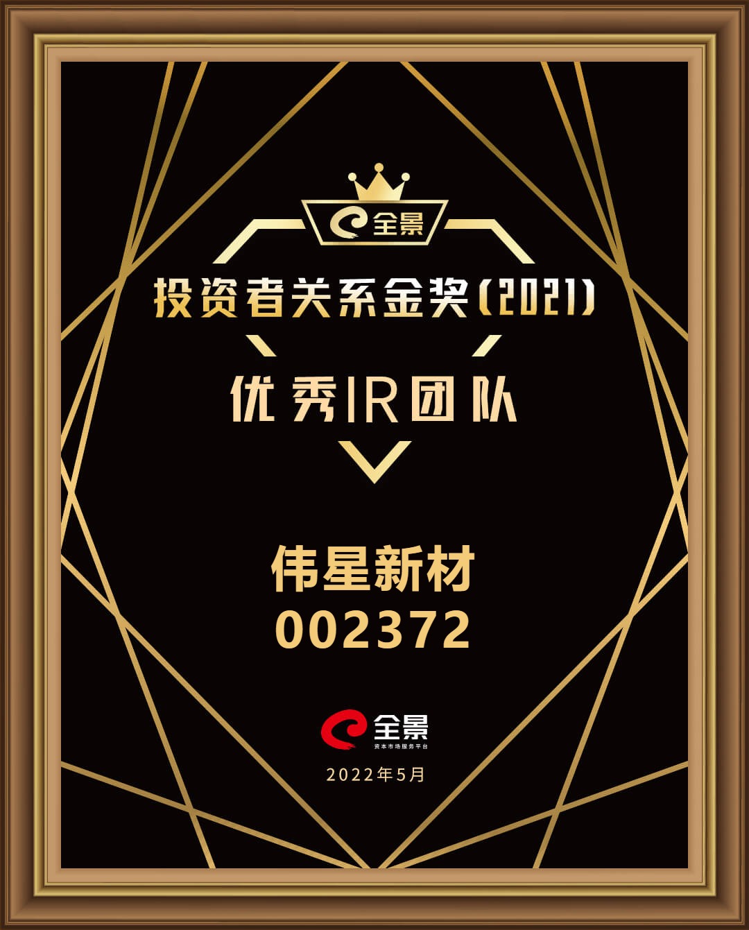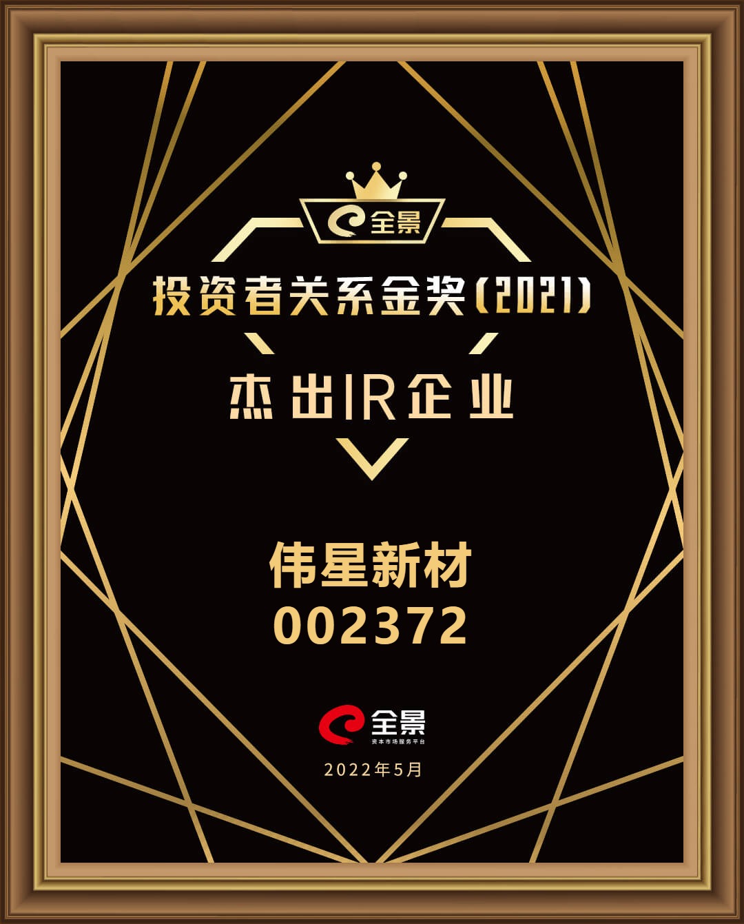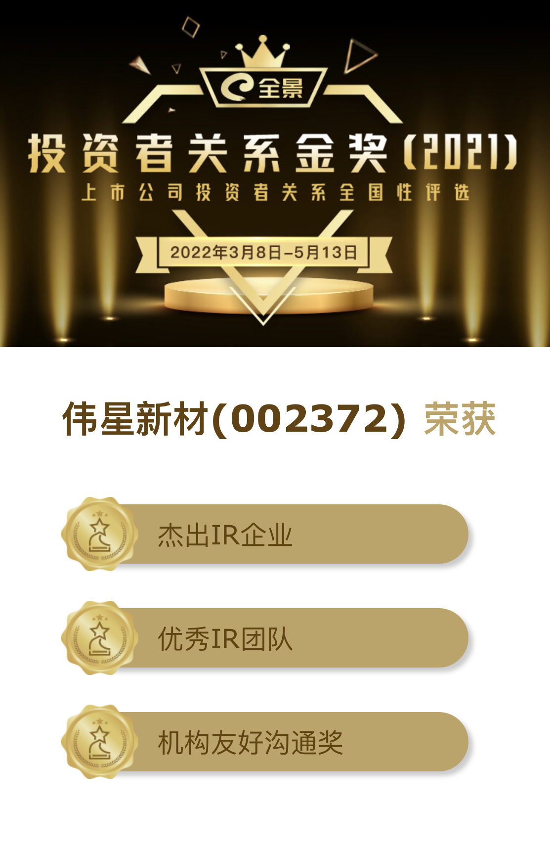 近日,由全景網主辦、南開大學中國公司治理研究院參與推出的2021年度“全景投資者關系金獎”獲獎榜單正式揭曉,偉星新材榮獲“杰出IR企業”“優秀IR團隊”“機構友好溝通獎”三大獎項。