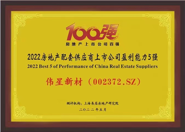 偉星新材憑借綜合實(shí)力,榮獲“2022房地產(chǎn)配套供應(yīng)鏈上市公司盈利能力五強(qiáng)”!