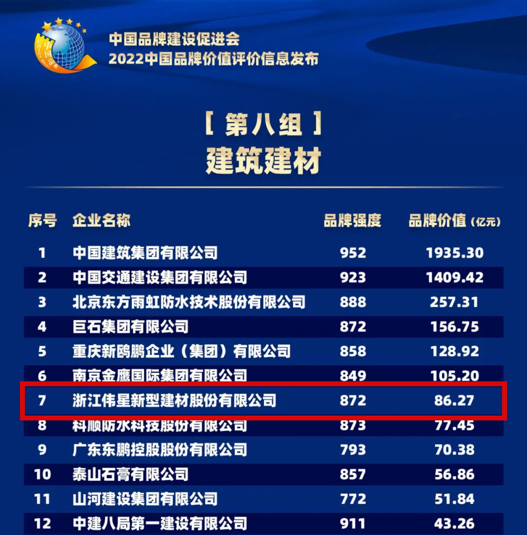 偉星新材品牌價值達到86.27億元,品牌強度872,位列建筑建材板塊第7位,向公眾展現公司的品牌力量!