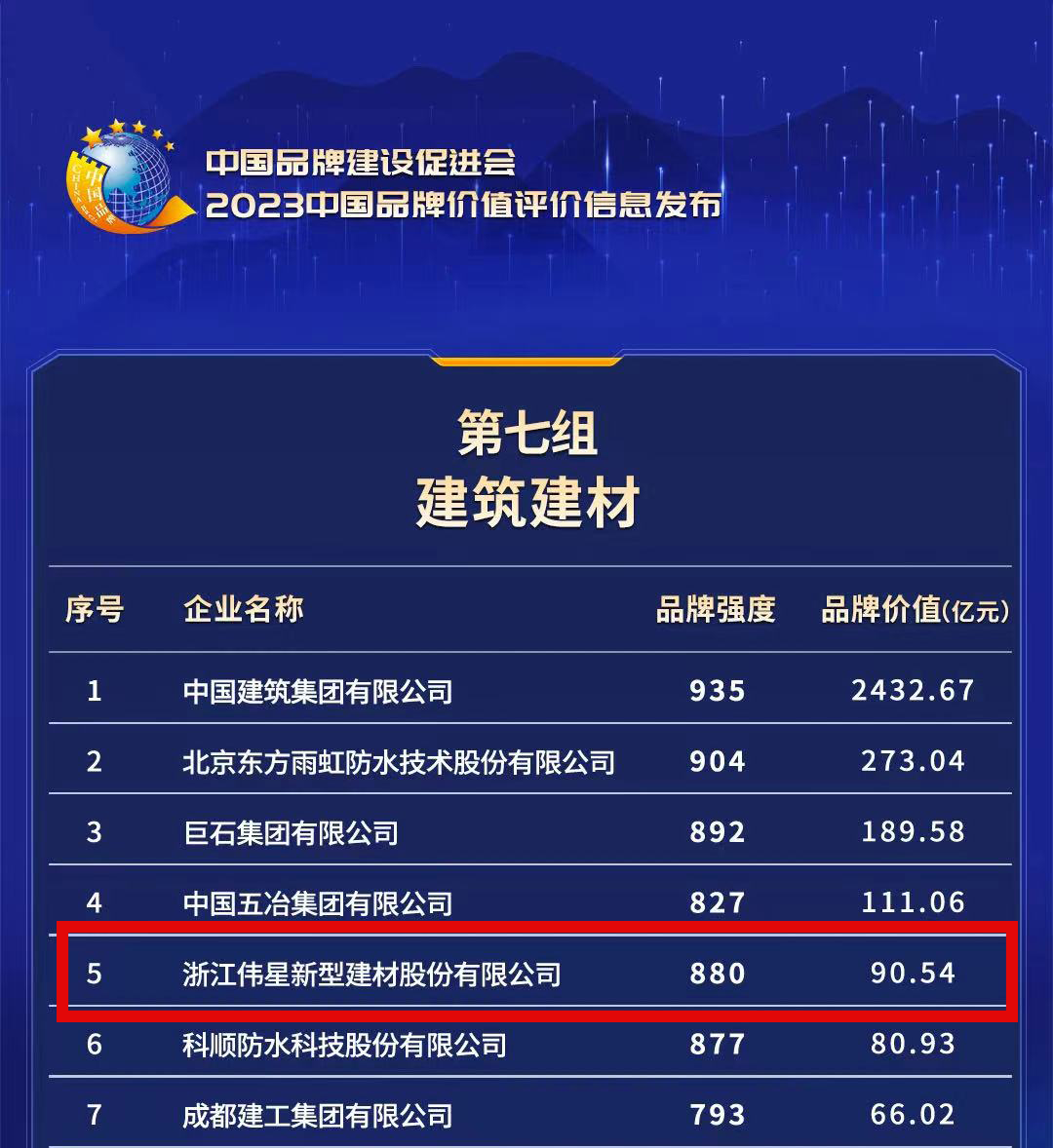 偉星新材品牌價值達到90.54億元,品牌強度880,位列建筑建材板塊第5位,品牌價值不斷提升,向公眾展現公司的品牌力量!