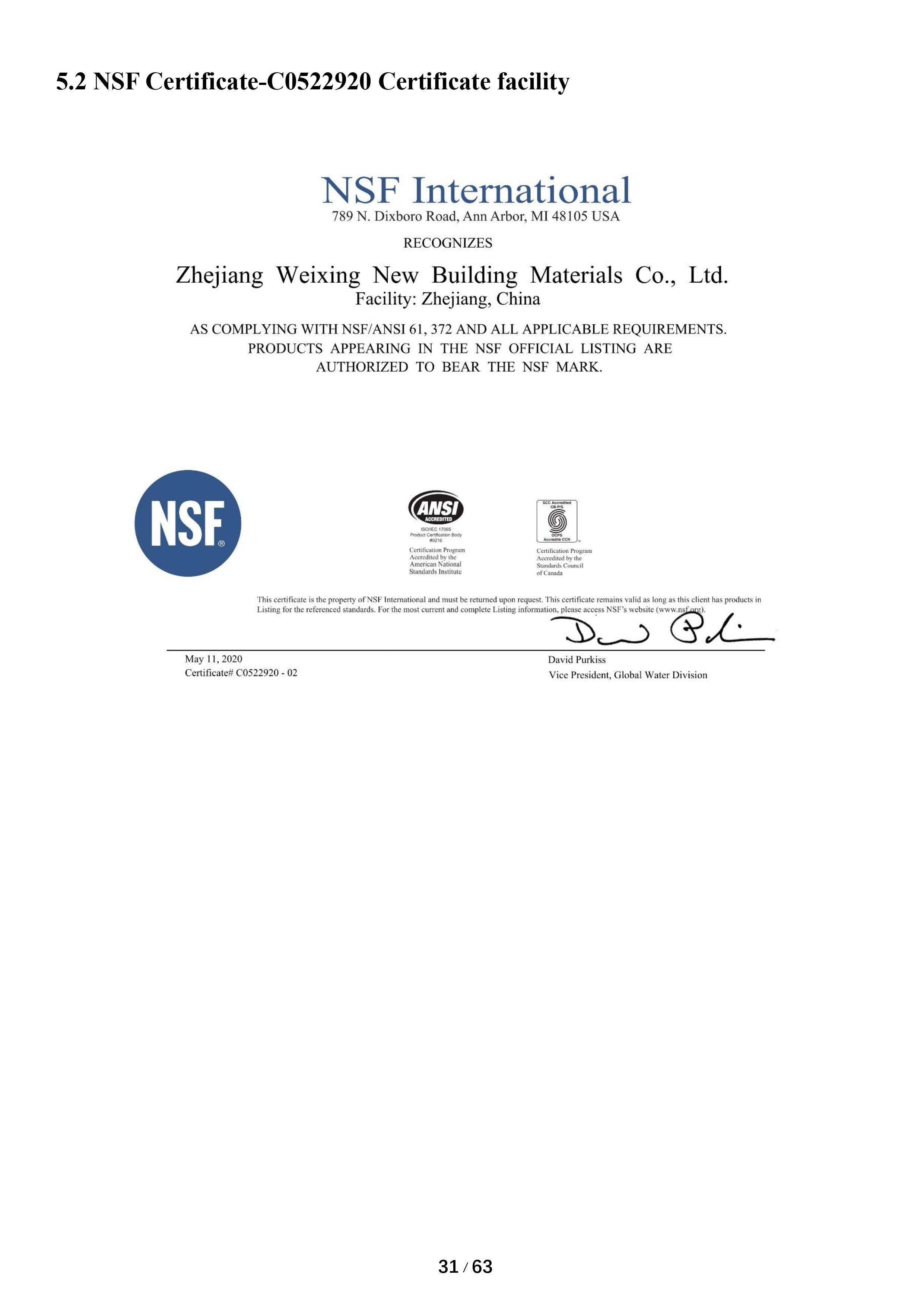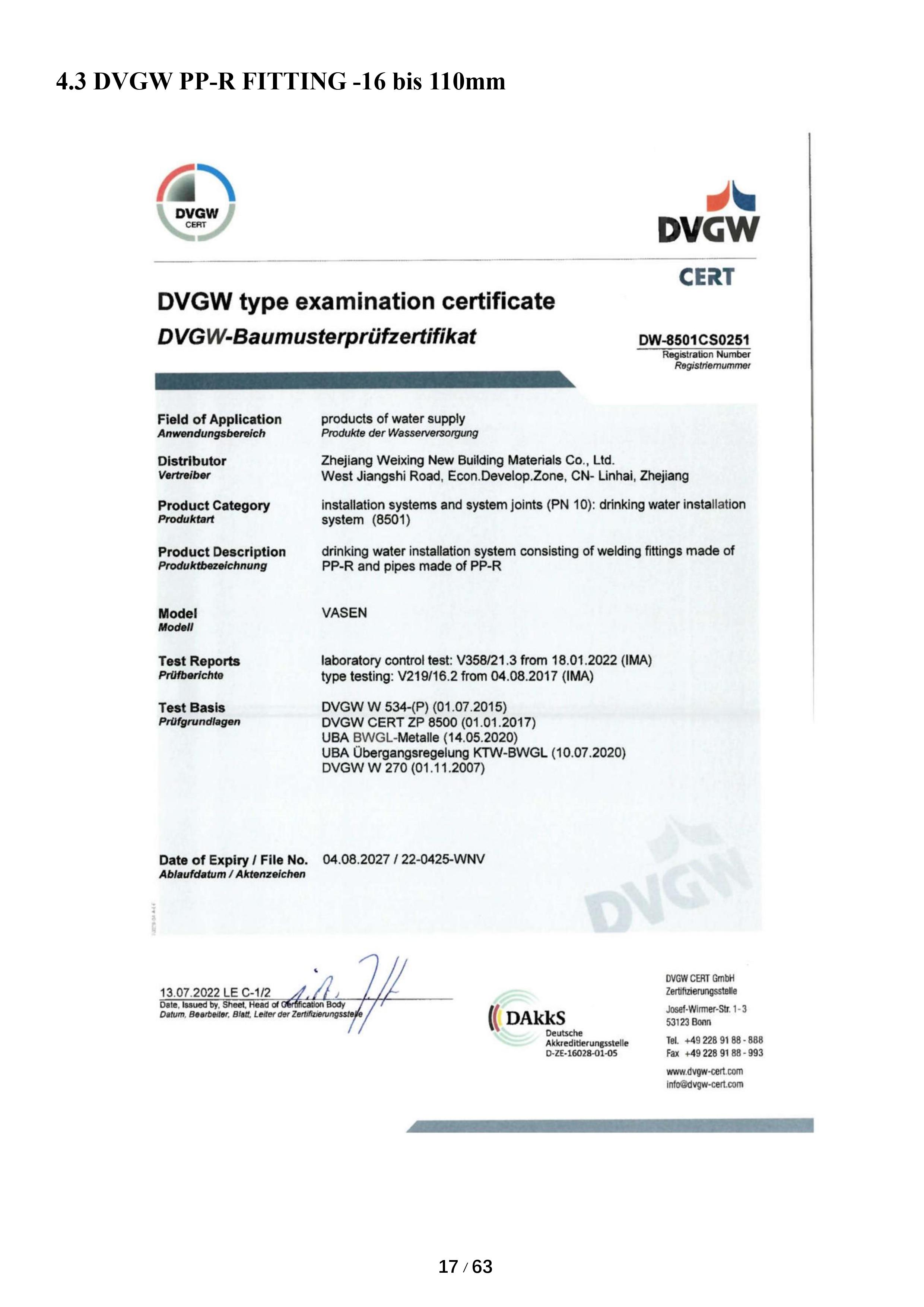 偉星新材的PPR管道系統是通過DVGW(德國燃氣與水工業協會)和NSF認證的綠色建材。DVGW自1859年起就致力于水氣專業技術工作,是業內最權威的檢測機構;NSF制定的水質安全檢測認證標準被稱為行業的最高標準。